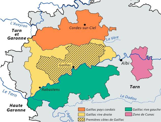De part et d’autre du Tarn, à une cinquantaine de kilomètres au nord-est de Toulouse, à l’ouest d’Albi, le vignoble gaillacois s’étend sur soixante-treize communes. Sa diversité de terroirs – premières côtes, hauts coteaux, plaine – lui permet d’offrir une large gamme de vins : rouges, blancs secs ou doux (parmi lesquels des vendanges tardives), rosés, mousseux et perlants dits « perlés »).